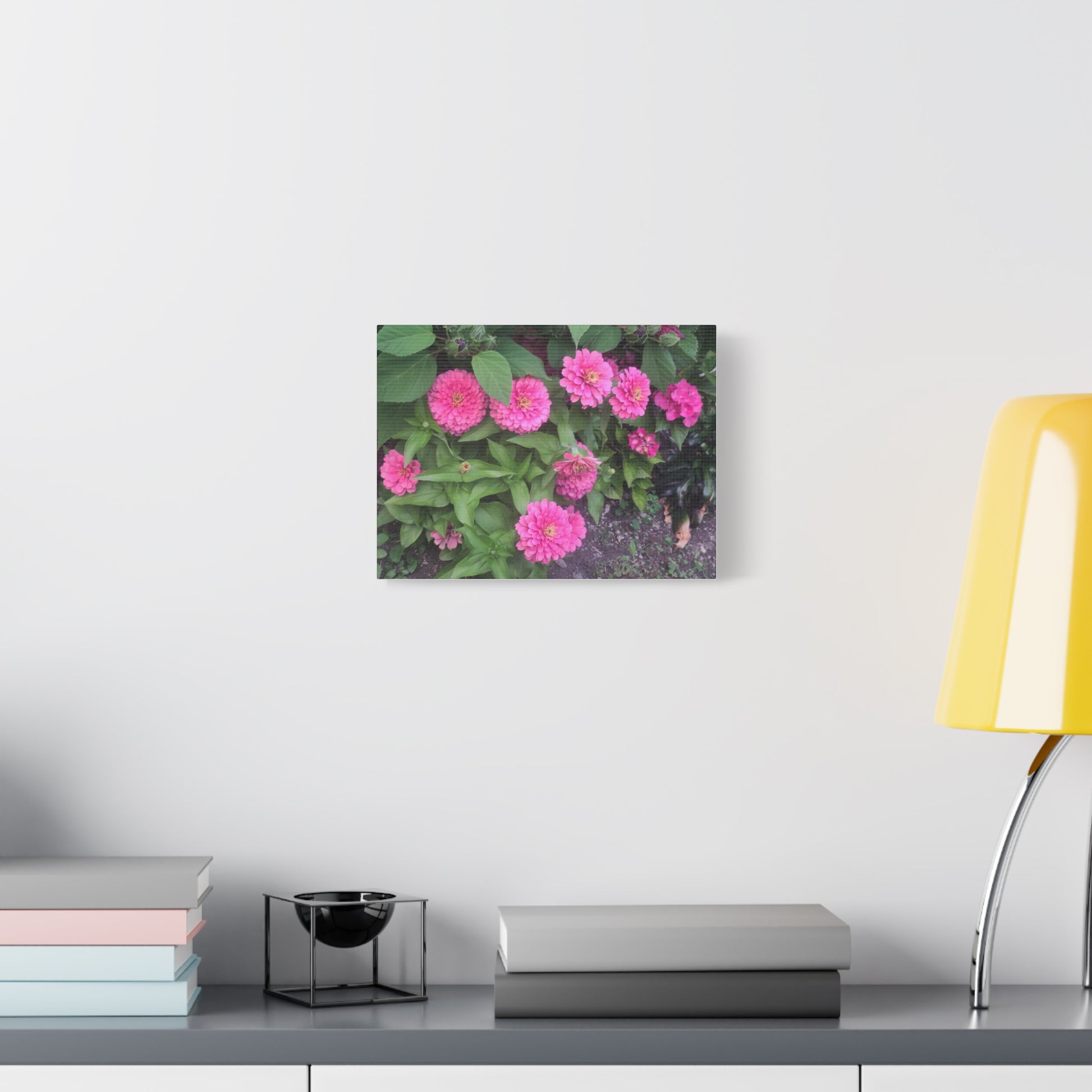 Bring a quiet garden moment into your home with this stretched matte canvas. Lush pink zinnias sit against deep green foliage, their layered petals and soft shadows preserved in rich, fade-resistant inks. The subtle matte finish reduces glare and gives the piece a painterly, intimate feel — like a snapshot from a late-summer afternoon. Built on a sustainably sourced radiata pine frame with soft rubber dots on the back for stable hanging, this canvas fits into living rooms, cozy reading nooks, or sunlit hallways where floral accents are welcome. It settles into calm interiors, brightens a neutral wall, and invites a slow, close look at everyday beauty.